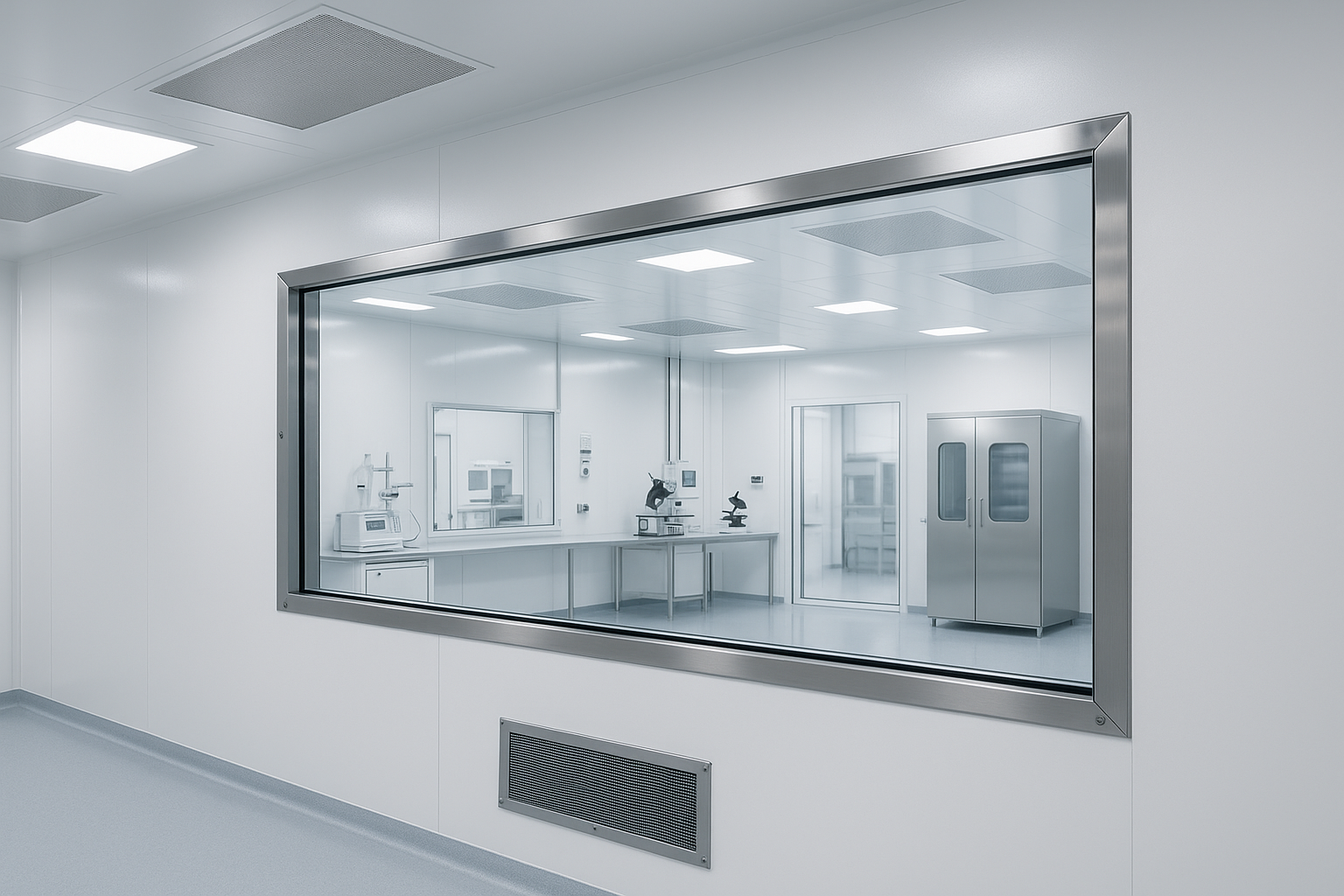 - Kompatibilita se sousedními dveřmi nebo přepážkami čistých prostor zajišťuje, že okna neohrožují kontrolované prostředí.